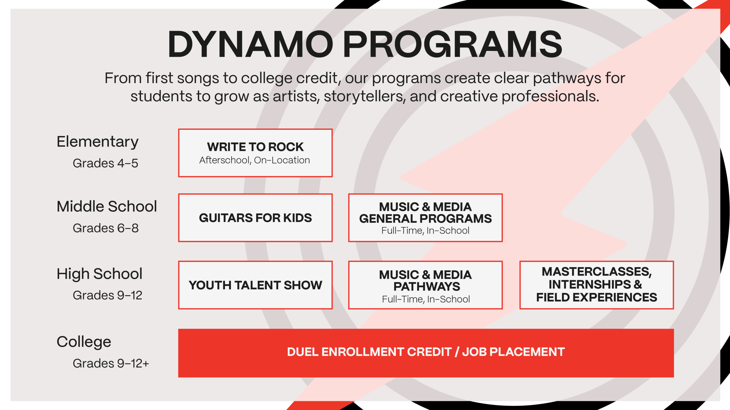 Dynamo Studios’ in-school programs bring the creative economy directly into classrooms, giving students hands-on access to music, media, and production skills during the school day. These programs are built to spark curiosity, build confidence, and provide practical tools that connect directly to real-world creative industries.